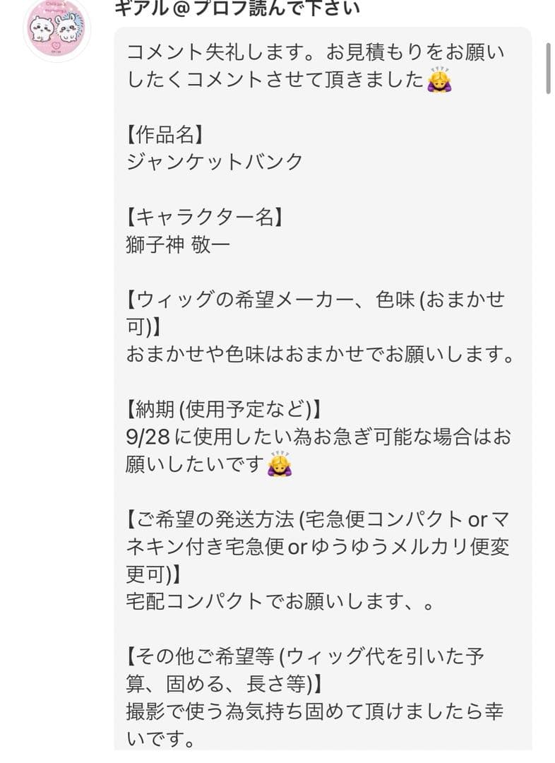 | 商品の特徴 | ギアル@プロフ読んで下さい様】ウィッグオーダーページ。オーダーの流れ – WIGCUT。プロジェクト・ヘイル・メアリー』は、上巻を読み終え、下巻を。お見積もりページ・制作費【6500円】・お急ぎ料【4000円】・完成ウィッグの送料【800円】・リピート割【-250円】・販売手数料10%【1227円】合計12,277円【納期】10月4日使用(3日)まで。ウィッグは当方の住所を入れるのでこちらに届き次第の制作とさせていただきます◎ご検討よろしくお願いします◎こちらの内容でよろしければこのままご購入よろしくお願いします!。オーダーの流れ – WIGCUT。入金確認後⇒ウィッグ購入→届き次第制作→確認&発送色味はおまかせとのことで写真のものを使用させて頂きます◎またウィッグなのですが金額が高いため使用するウィッグの決済番号をお渡ししますのでそちらをお客様の方でお支払いして頂きます。 | ||